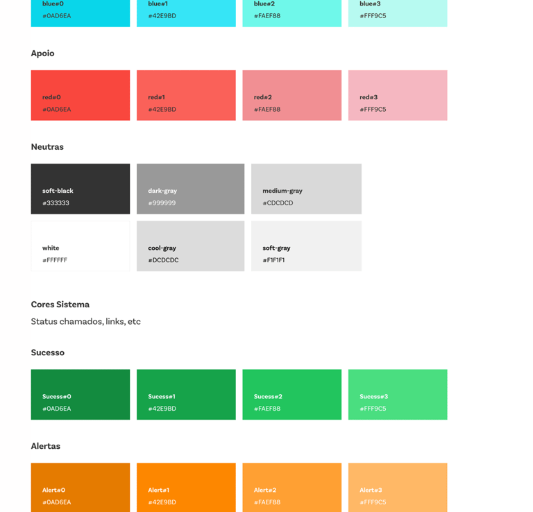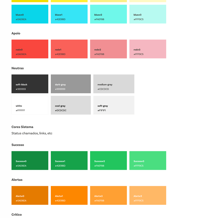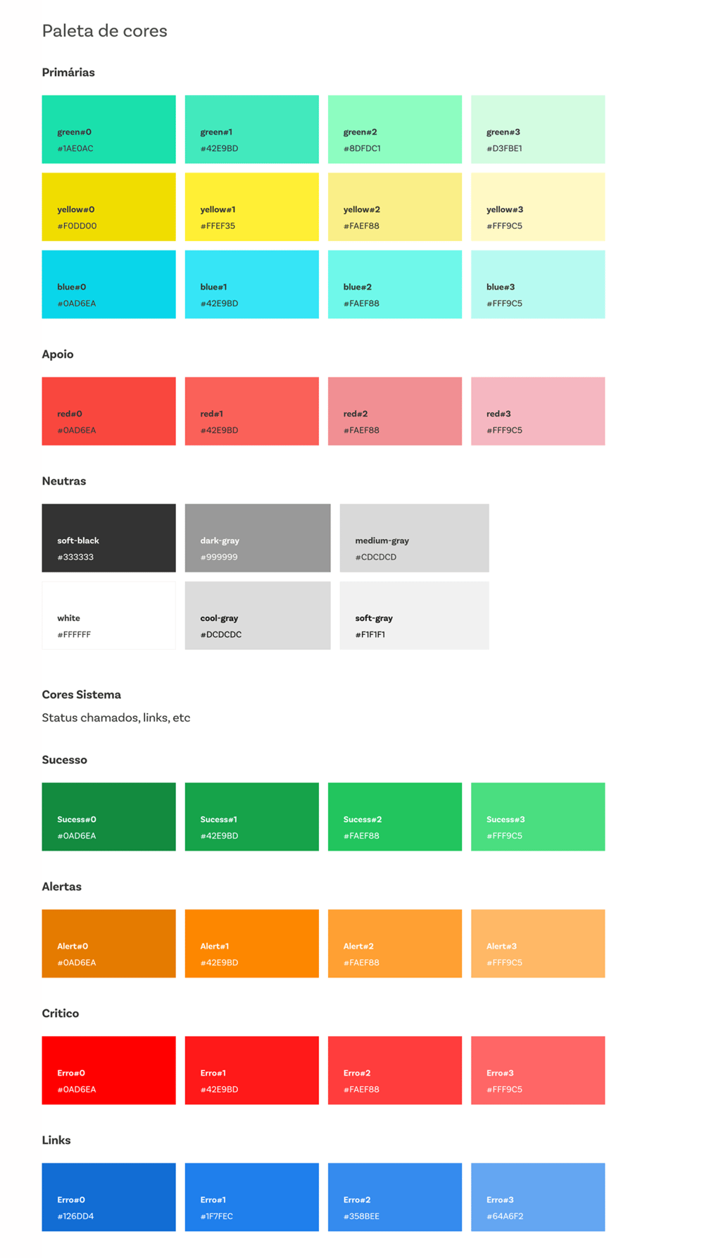Agora um guia completo, onde estou prevendo o uso de 3 cores principais, definido no guia da marca, cores neutras para texto e background e cores de alerta de sistema, que geralmente é padrão.