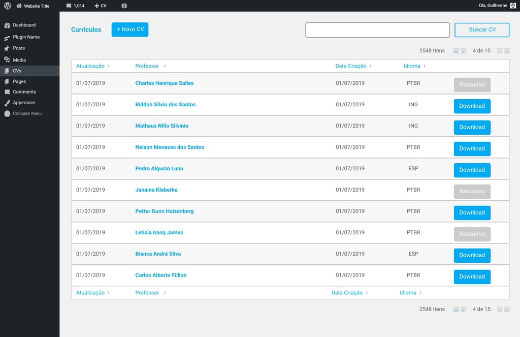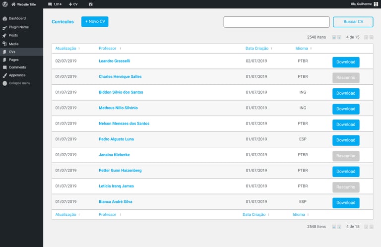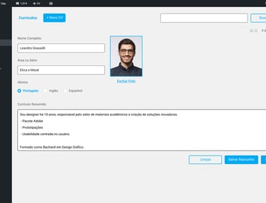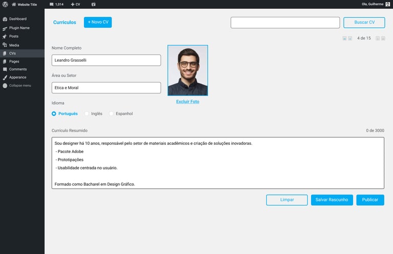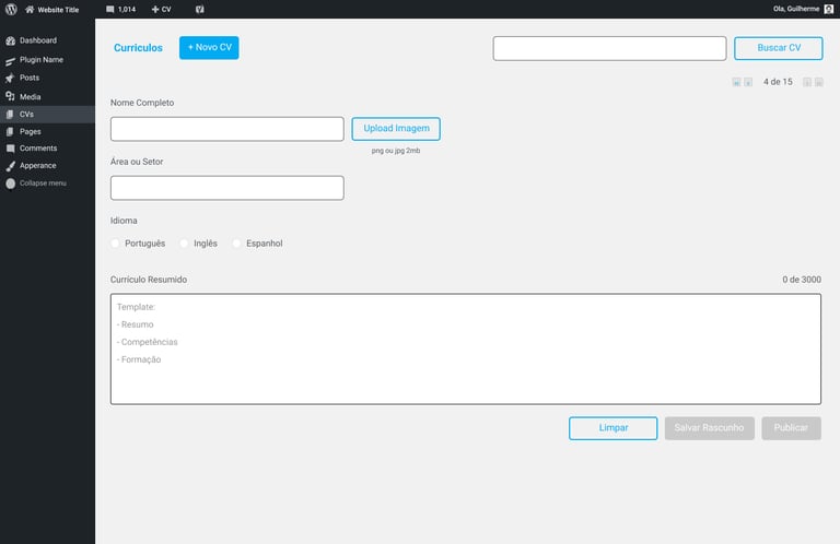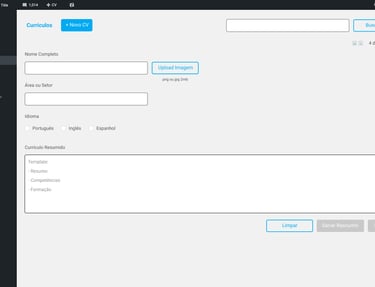 Como a ideia não era criar uma ferramenta com interface própria, usamos a do wordpress para fazermos a aplicação de CV.